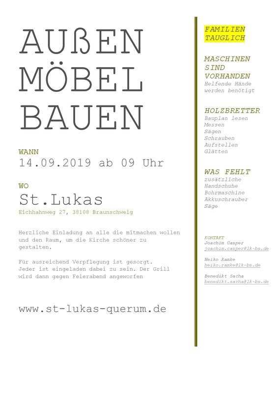 Um diesem Ort noch einladender zu gestalten und noch mehr Möglichkeiten der Nutzung zu schaffen, sollen Sitzmöbel selbst gebaut werden. Keine aufwendigen Konstruktionen, die eine Tischlerlehre voraussetzen sondern einfache, praktische Möbel.