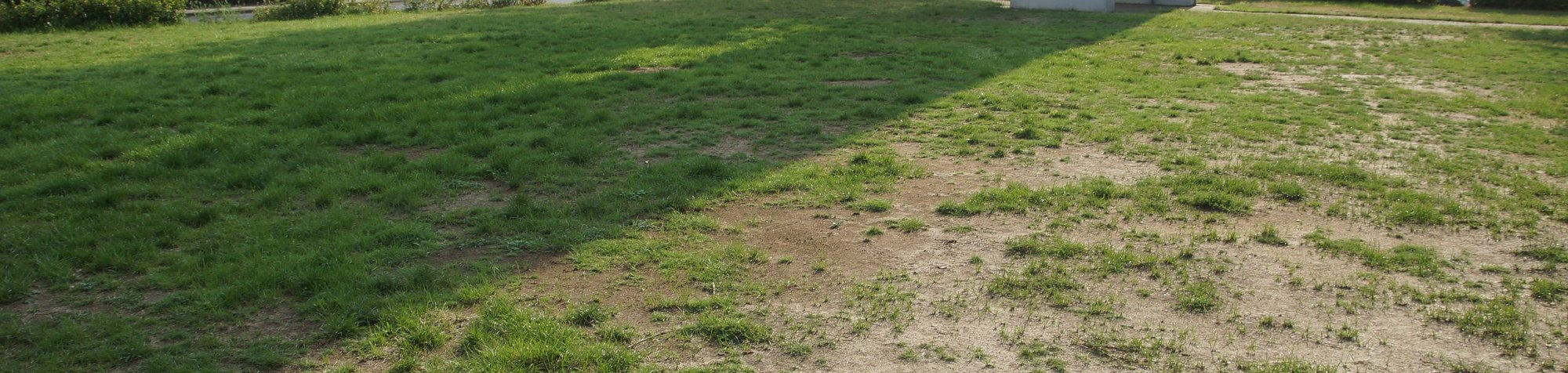 Inzwischen hat sich die Fläche ein wenig erholt, teilweise ist wieder ein dichtes Grün vorhanden. Mit professionellem Gerät soll der Rasenfläche wieder Luft zum atmen gegeben werden. Und natürlich gedüngt und und neu ausgesät.