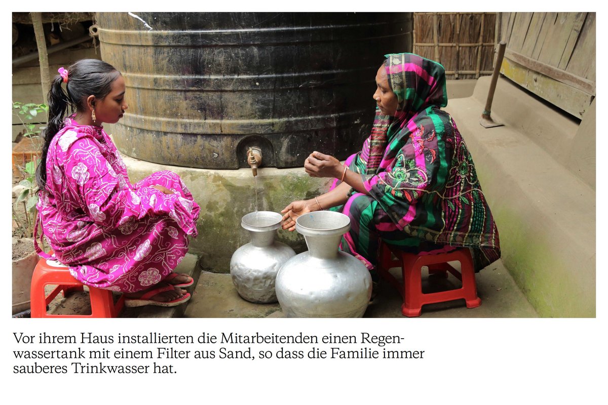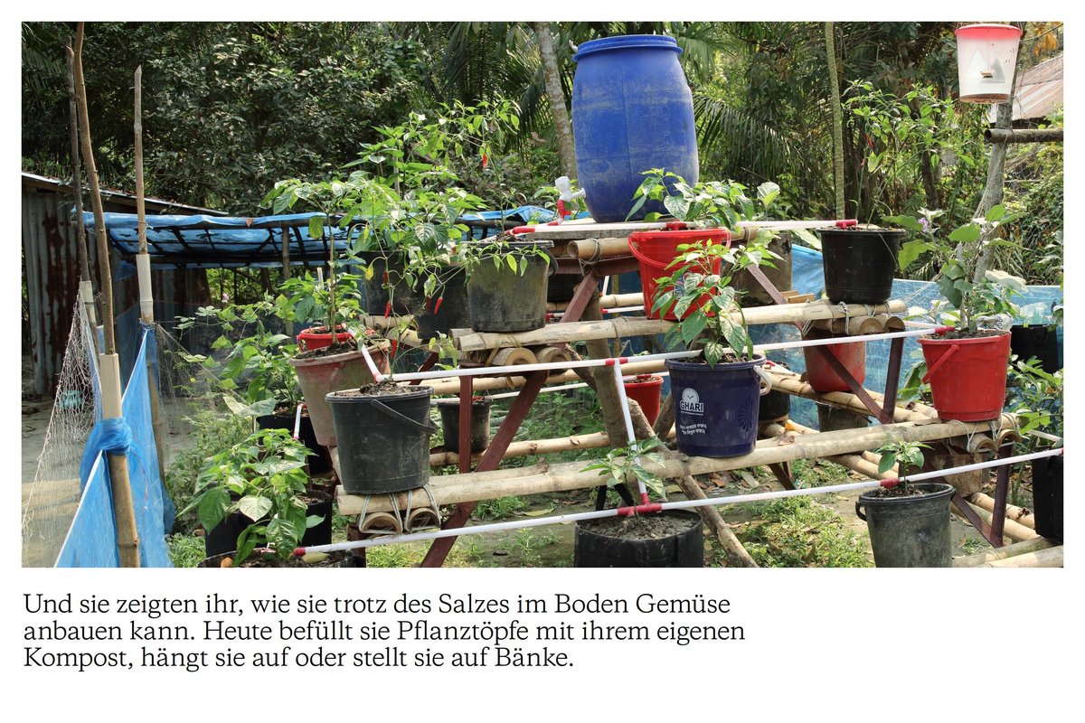Die gaben ihr salzresistentes Saatgut, installierten vor ihrem Haus einen Regenwassertank und zeigten ihr, wie sie trotz des Salzes im Boden Gemüse anbauen kann. Insgesamt profitieren vom Projekt der Organisation mehr als 10.000 Menschen.