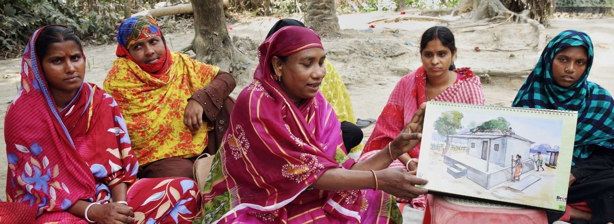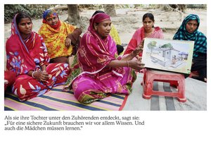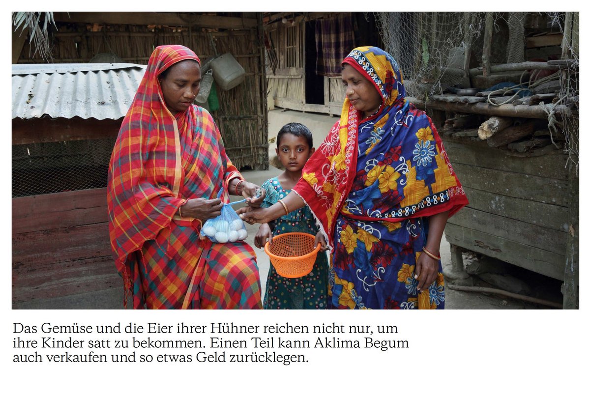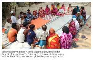 Seit zwei Jahren geht es Aklima Begum so gut, dass sie begonnen hat, ihrerseits die Leute in der Nachbarschaft zu unterstützen. Alle paar Monate versammelt sie sie vor ihrer Hütte und gibt weiter, was sie selbst gelernt hat. Ihre wichtigste Erkenntnis: „Für eine sichere Zukunft brauchen wir vor allem Wissen.“