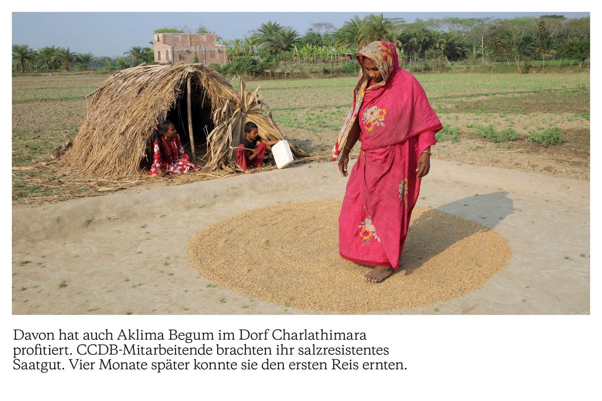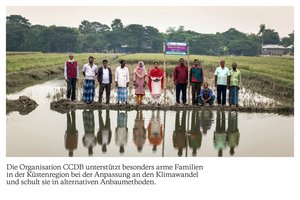 Seit 2012 unterstützt CCDB besonders arme Familien in der Küstenregion bei der Anpassung an den Klimawandel. Das von Brot für die Welt geförderte Projekt trägt dazu bei, die Lebensumstände von mehr als 10.000 Menschen zu verbessern. Sie erhalten unter anderem salzresistentes Saatgut sowie Schulungen zu alternativen Anbautechniken. Außerdem werden sie bei der Errichtung von Regenwassertanks und Wasseraufbereitungsanlagen unterstützt.